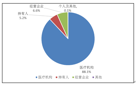 持有人、經(jīng)營企業(yè)和醫(yī)療機(jī)構(gòu)是藥品不良反應(yīng)報(bào)告的責(zé)任單位。按照?qǐng)?bào)告來源統(tǒng)計(jì),2019年來自醫(yī)療機(jī)構(gòu)的報(bào)告占88.1%;來自經(jīng)營企業(yè)的報(bào)告占6.6%;來自持有人的報(bào)告占5.2%;來自個(gè)人及其他報(bào)告者的報(bào)告占0.1%(圖3)。