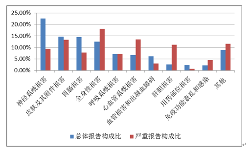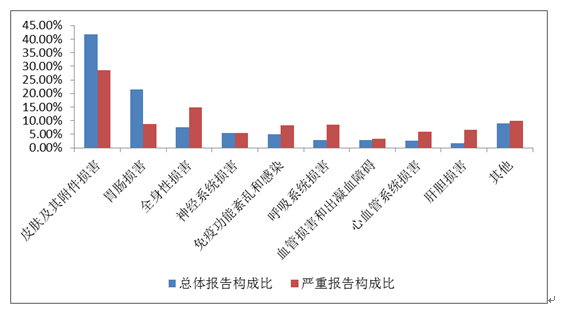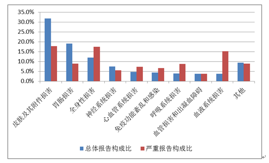 2019年國家基本藥物化學(xué)藥品和生物制品不良反應(yīng)/事件報(bào)告,按照藥品類別統(tǒng)計(jì),報(bào)告數(shù)量排名前5位的分別是抗微生物藥、心血管系統(tǒng)用藥、抗腫瘤藥、激素及影響內(nèi)分泌藥、治療精神障礙藥;累及器官系統(tǒng)排名前5位的是皮膚及其附件損害、胃腸損害、全身性損害、神經(jīng)系統(tǒng)損害以及血液系統(tǒng)損害。