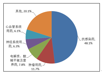 按照藥品類別統(tǒng)計(jì),化學(xué)藥品占86.6%,中藥占12.6%,生物制品占0.8%。化學(xué)藥品排名居前的藥品類別是抗感染藥、心血管系統(tǒng)用藥、腫瘤用藥、神經(jīng)系統(tǒng)用藥、電解質(zhì)、酸堿平衡及營養(yǎng)藥;中藥排名居前的藥品類別是理血?jiǎng)⒀a(bǔ)益劑、祛濕劑、開竅劑、清熱劑。